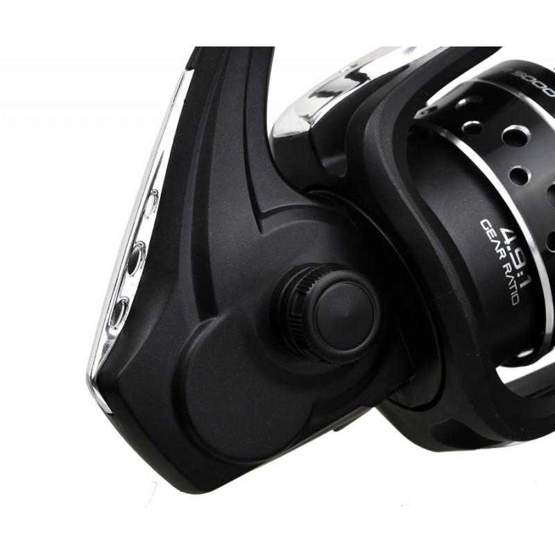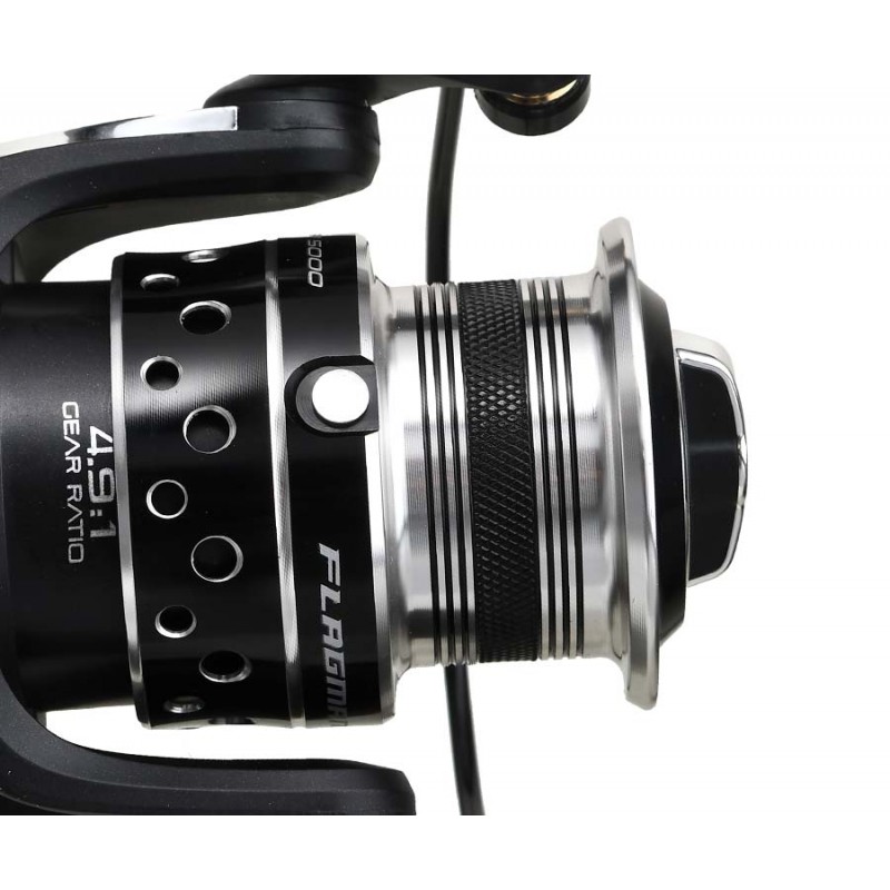 Безынерционная катушка Flagman Force Rank Feeder 5000 — серия фидерных катушек, в которых надёжность и высокие тяговые характеристики сочетаются с доступностью для широкого круга рыболовов. Корпус и ротор изготавливаются из высокопрочного пластика, обеспечивающего лёгкость и устойчивость к механическим повреждениям. Мощная главная пара и шарикоподшипники, установленные в самых нагруженных точках, гарантируют значительный ресурс механизма при интенсивной эксплуатации. Кулисный механизм системы S-Curve Oscillation обеспечивает качественную перекрёстную укладку лески без горбов и провалов, а устойчивый к истиранию ролик лесоукладывателя системы Anti-Twist предотвращает перекручивание шнура при намотке. Облегчённая алюминиевая шпуля оптимизирована для работы с тонкими лесками и плетёными шнурами. Шпуля оснащена круглой металлической клипсой для надёжной и безопасной фиксации дистанции при фидерной ловле. Конический буртик значительно уменьшает трение лески при сходе, повышая дальность заброса. Специальная полоса с мелкой насечкой на поверхности шпули препятствует проворачиванию намотанной лески под большими нагрузками. Фрикцион обладает точной плавной регулировкой и стабильной работой в любых условиях. Металлическая ручка с обрезиненной рукоятью обеспечивает надёжный и уверенный хват даже в сырую погоду.