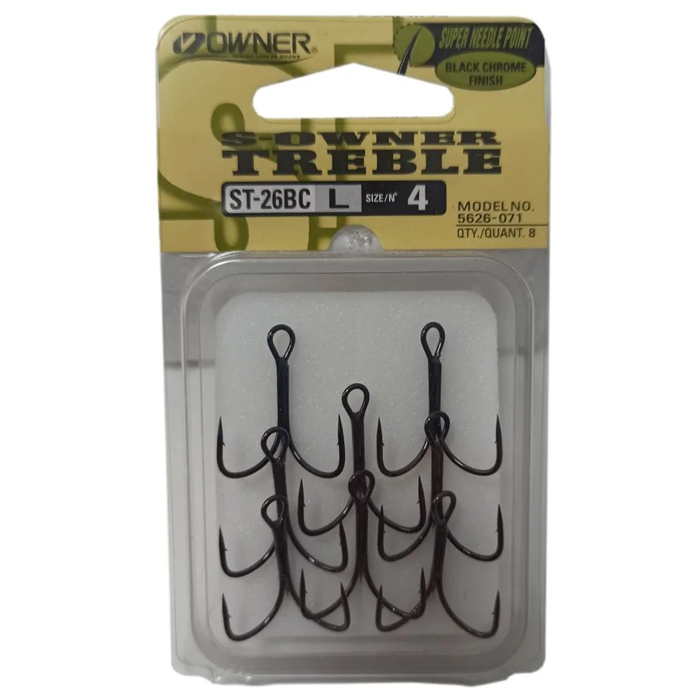 Крючки-тройники Owner ST-26BC — серия тройных крючков, по прочностным характеристикам занимающая золотую середину между популярными сериями ST-11 и ST-36. Крючки выполнены из проволоки, которая с одной стороны не слишком толстая для сохранения деликатности оснастки, а с другой — достаточно надёжная, чтобы справиться с весьма достойным трофеем. Изготовленные максимально аккуратно, тройники имеют острейшую заточку жала типа Super Needle Point™ и миниатюрную бородку, которая надёжно удерживает рыбу, практически не травмируя её при вываживании. Защитное покрытие Black Chrome (чёрное хромовое) обеспечивает коррозионную стойкость и маскировку крючка в воде.