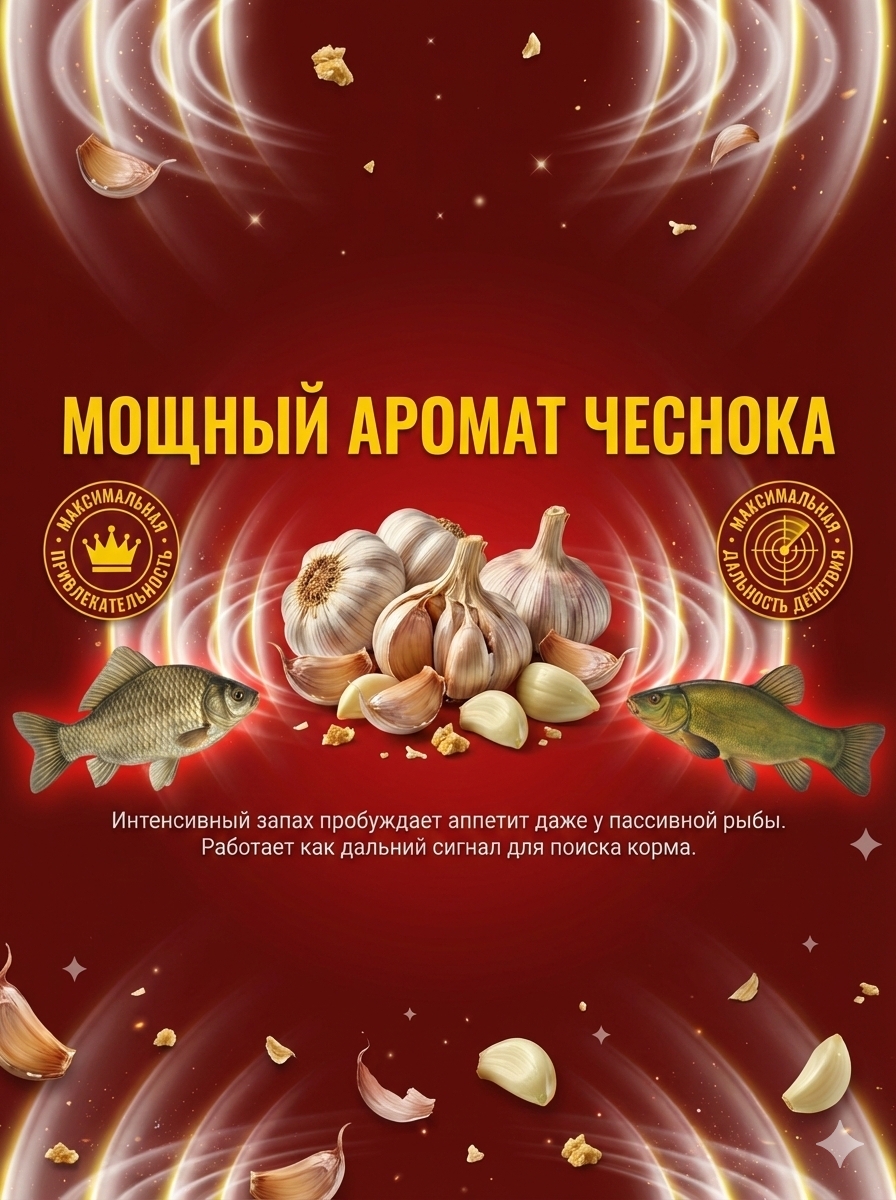 - ✅ Натуральный чесночный аромат — мощный привлекающий фактор для капризной рыбы;